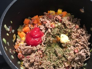 As well as a diced large (or 2 small) onions, 2 diced sticks of celery and a diced large carrot I diced up half a swede (swede is the yellow one in England) and retrieved a 250g pack of minced lamb from the fridge. I always seem to have small packs of smoked pancetta lardons in the freezer so I added the contents of one of those to a heated dry pan to render the fat down and turn them into gems of bacony loveliness. Once they were brown, I added the minced lamb in a few batches to fry it and avoid stewing. Once the meat was all browned, I set it aside whilst ensuring the bacon and lamb fat remained in the pan. That’s when I threw in the veggies with a few anchovy fillets. Once the veggies were starting to soften (and the anchovies had melted in), I bunged the meat back in and gave it a good stir. This is the time to add herbs (I just used mixed herbs – add your favourites) a little garlic (I like the lazy stuff in a tube), a few dashes of Worcestershire sauce and 1-2 tablespoons of tomato ketchup. Even Michel Roux Jr uses Tommy K in his Shepherds Pie! Then it’s time to add stock to just cover and as this is a dark meat sauce – don’t forget to pop in a Star Anise! And of course don’t forget to fish it out later.