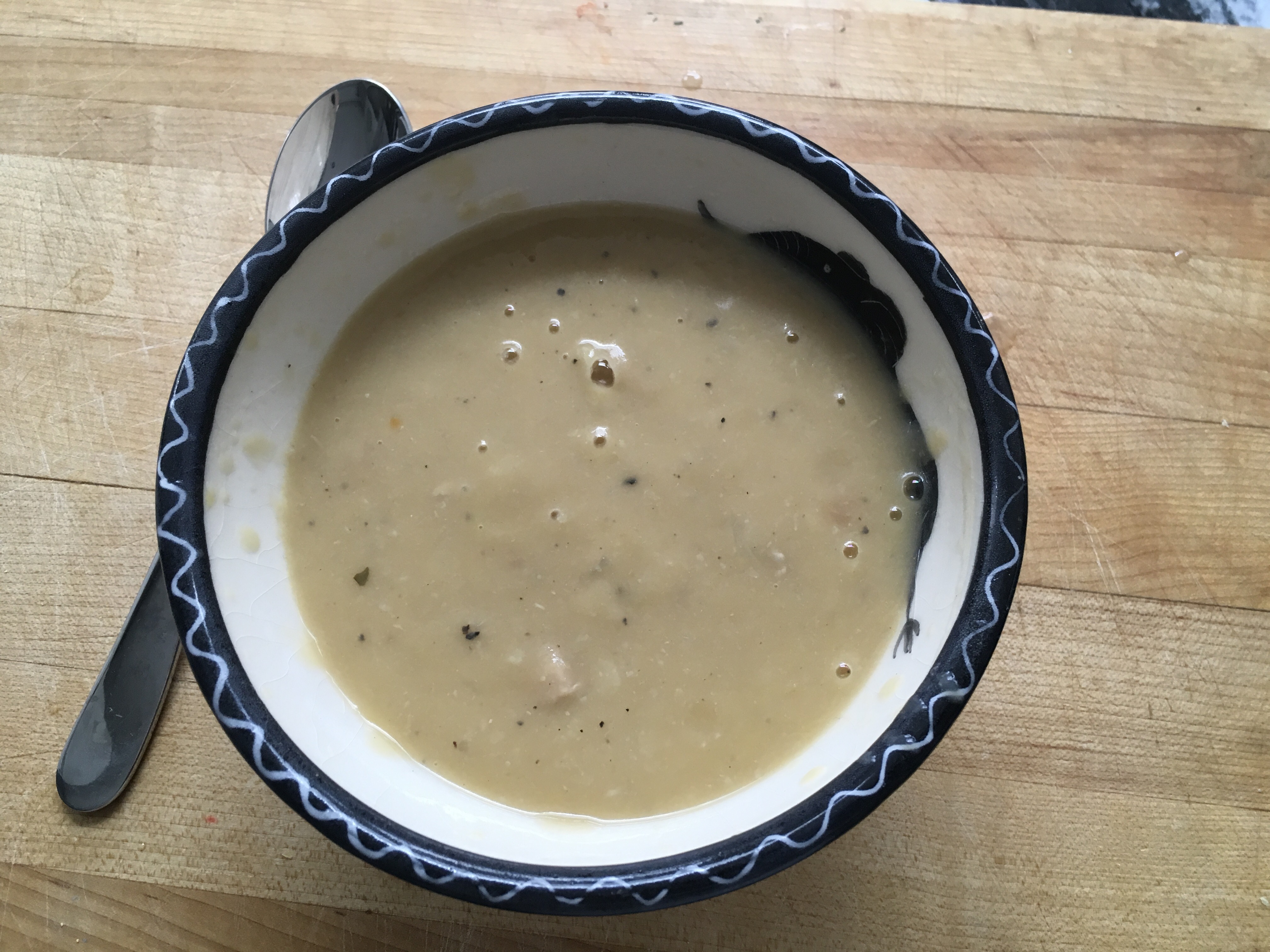 This impromptu masterpiece looks almost like popular canned versions of cream of chicken soup, but has the advantage of having no dairy whatsoever in it. Unfortunately, whilst you may crave creamy, stomach-lining foods when your tummy’s on the spin cycle, this can irritate the lining of the gut, making the situation worse. This soup gave me a warming, comforting hug and made me feel a bit like I imagine my little Westies feel when I give them a belly rub.