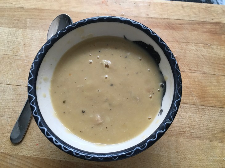 I returned to the pan occasionally to give it a stir and check on how the vegetables were doing. Once the veg was nice and soft (yielding under attack from a spoon), I picked out as many of the chicken chunks as I could be bothered to fish out and blitzed the rest up in a blender. Safety first – it’s best to allow a bit of cooling to occur before blending to avoid being scalded by the very thing which is supposed to make you feel better. I returned the now smooth soup to the pan and stirred in the chicken chunks to warm it all through.